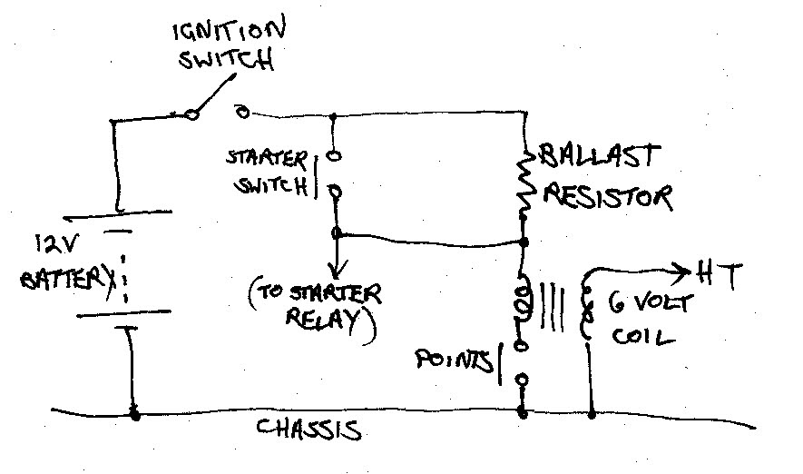 The ignitional coil can be swapped for a 12v version or you can retain the 6v coil and run it with a Ballast Resistor (BR). The BR is used to drop the voltage at the Coil from 12v to about 7-9v. Except when cranking the engine when 12v is applied to compensate for the voltage drop caused by the Starter Motor operating.