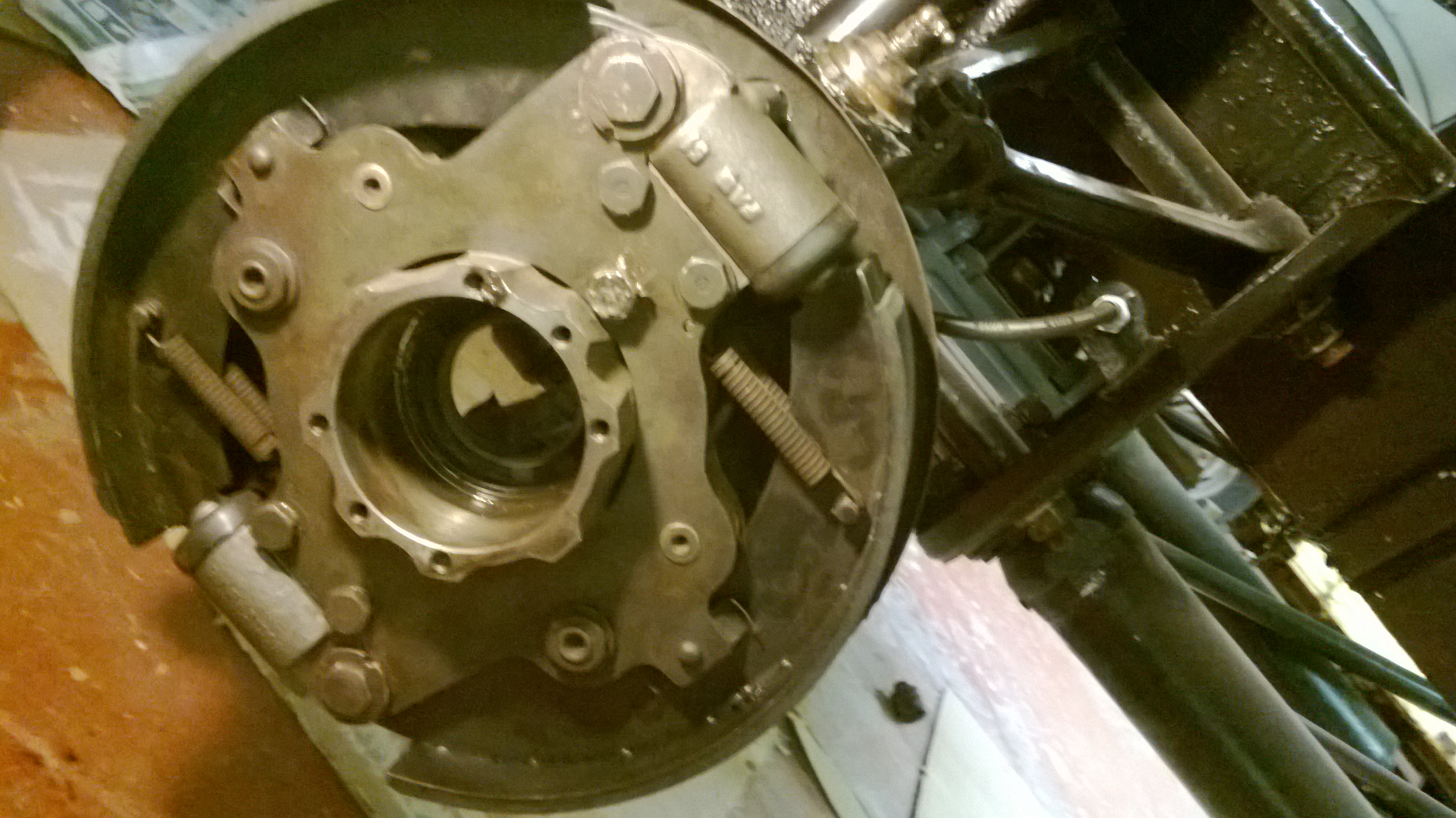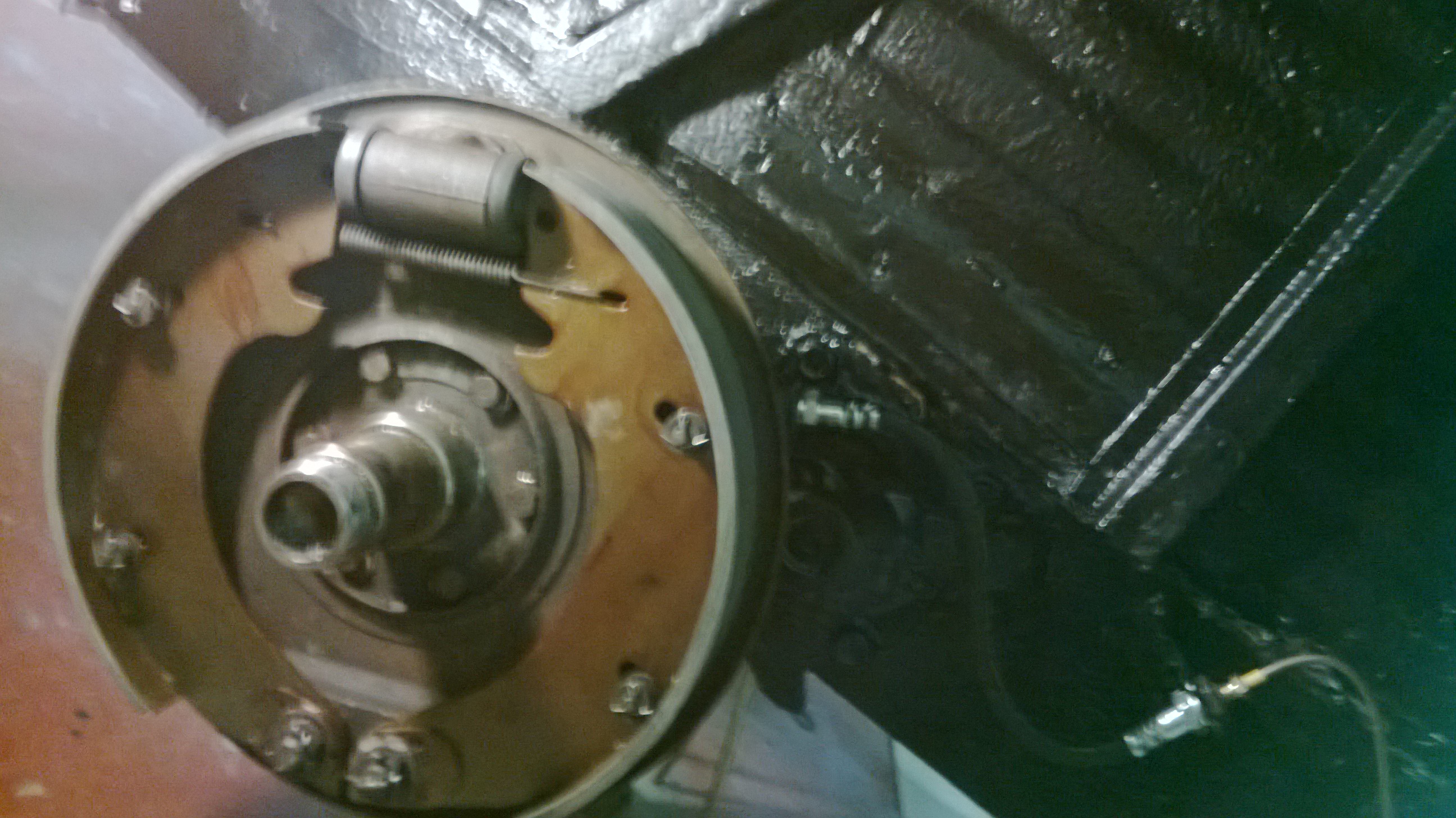 8th January 2014 - The Front Brakes have been assembled using the relined Brake Shoes which have been fitted along with the l rebuilt Slave Cylinders and the new Flexi brake hoses, see photo :