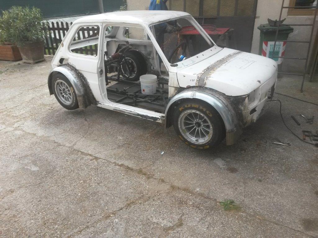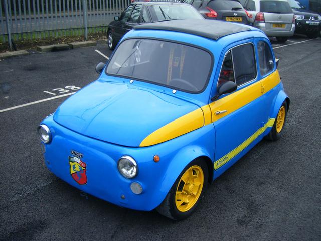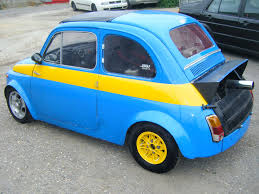 - This highly modified FIAT 500 has been raced in Italy but not in the UK. Its specification includes a mid-mounted engine transmitting drive via a race clutch to a Volkswagen Type 1 gearbox and transaxle with modified output shafts, while the car's underside is braced by an additional spaceframe. The engine is a 1,000cc Autobianchi A112 four-cylinder, which incorporates an Abarth crankshaft, high-lift camshaft, blueprinted pistons, lightened flywheel, Holley twin-choke carburettor, electronic ignition and a four-branch exhaust manifold feeding a (loud) free-flow exhaust. We are advised that the maximum power output is approximately 80bhp. Upgrades to the running gear include adjustable front suspension; FIAT Punto electronic power steering; vented front brake discs and wider wheels (12" diameter front; 10" diameter rear).